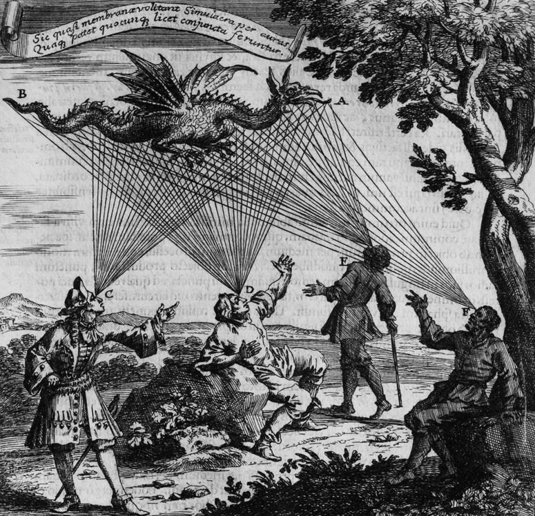Johannes Kepler (b.1571) directly followed Al-Haytham's formalism to its inevitable and logical conclusion in his mechanistic theory of the retinal image, which replaced its impressionistic predecessor. However, even Kepler struggled to accept what Al-Haytham called the "monstrous" distortion of sensation that would be provoked by such an inversion. It remained for René Descartes (b.1596) to compile his own theory of vision, beautifully illustrated with diagrams and far closer to our current understanding (Figure 4).