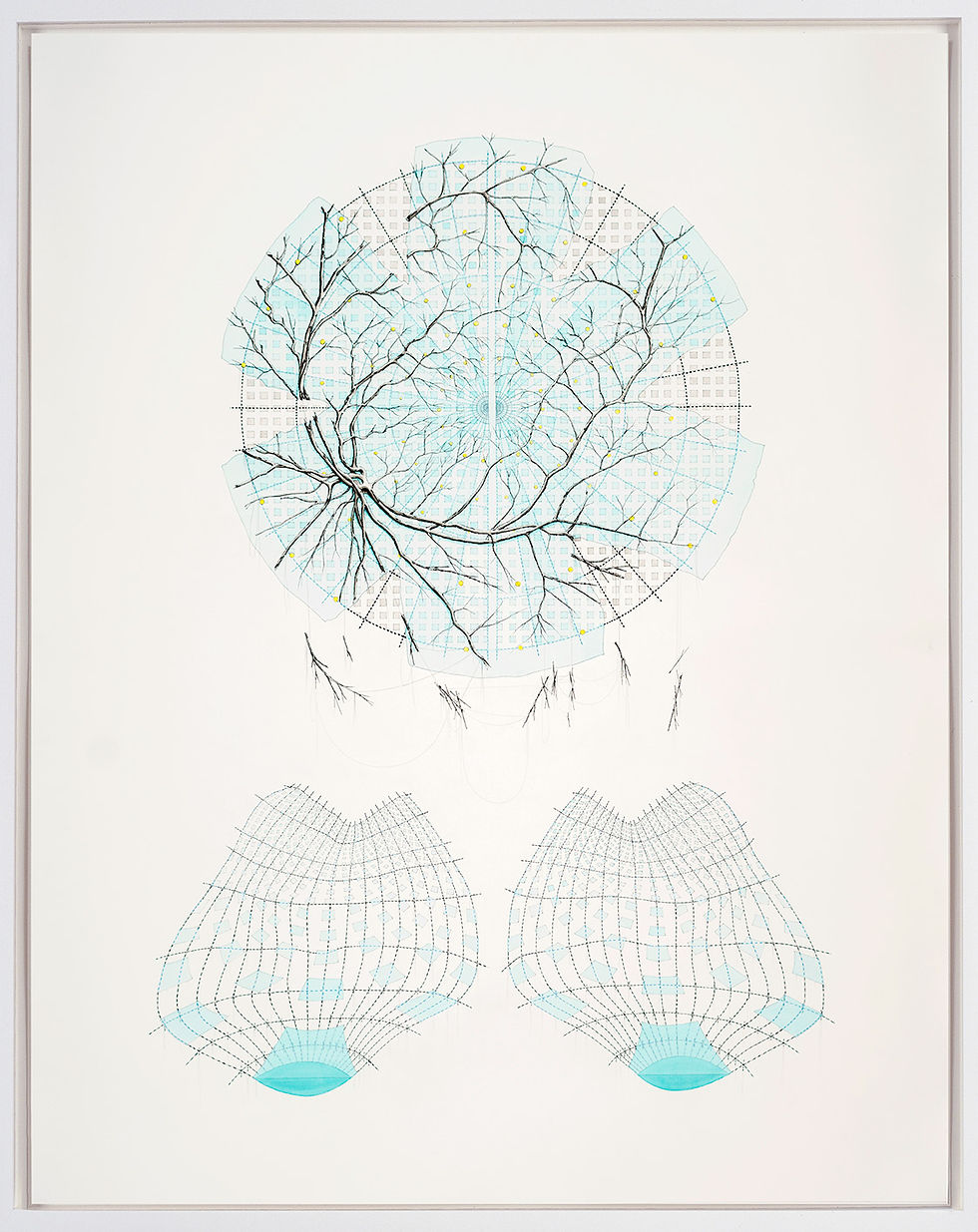Figure 8: Optic tract, Michael Whittle, (Neural network detected retinal vasculatures with catenoid and two point source interference patterns), 2017, 97 x 92 cm, Ink, pencil, and watercolour on paper.
