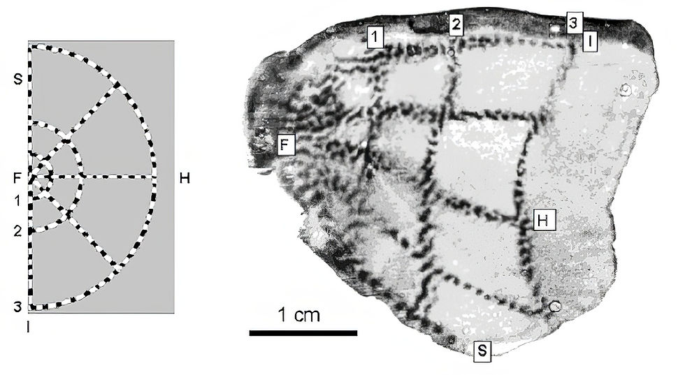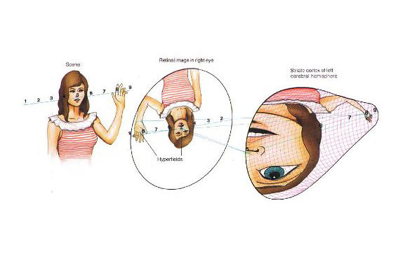 When the visual cortex of the Macaque was removed and simply pressed onto a radio-sensitive plate, the radioactive marker had become concentrated enough in the most active cells to leave a trace on the plate. The external, striped target on the left was shown to map directly onto the internal, organic material of the brain on the right. Point F represents data captured by a small area of incredibly highly sensitive retina known as the Fovea, where detail is at its highest.