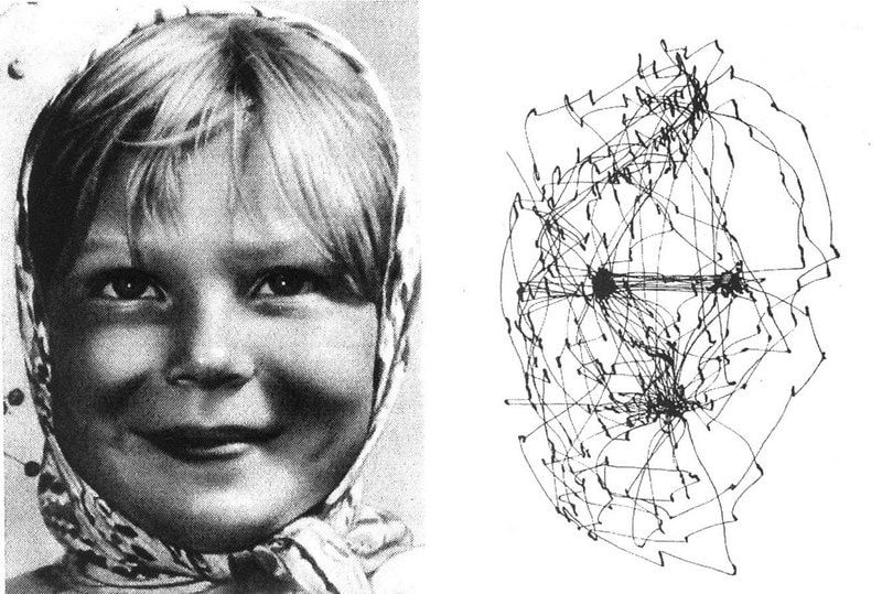 One of the pioneering researchers of how the human visual system relies on such diagrammatic eye movements was the Russian psychologist Alfred Yarbus (1914-1986). Yarbus conducted several influential experiments using suction caps attached to the eyes to track eye movements while participants viewed various images and scenes. His most famous study, published in the book "Eye Movements and Vision" (1967), demonstrated that the way people move their eyes while looking at a picture depends on the task they are given or the information they are seeking.