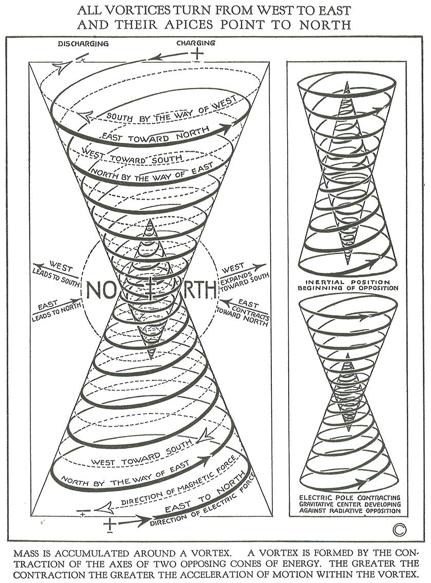 This philosophy was built on a series of dualities: generation and radiation, compression and expansion, male and female. All matter, he claimed, was simply 'motion,' and that motion followed a precise, wave-like, spiral journey from the 'stillness of the One Light' into apparent form and back again. 'Two-way sex-conditioned spirals,' he declared with his signature casual authority, 'are the consummate individuals of all Creation.' It was this complex, cyclical, and deeply patterned vision that his diagrams were designed to prove.