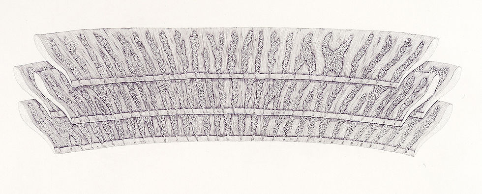 This idea of seeing through another's eyes resonates with a formative experience. As a student, I had the opportunity to visit a collection of medical specimens. One exhibit consisted of slices of a human head, each about 3cm thick and encased in glass. By removing the front slice, I could hold it up to my face and literally look through another human's eye sockets. That moment—of clinical observation combined with the profound, intimate act of seeing through another's eyes—stayed with me. It wasn't until I created the drawing Clouds, Glands, Tributaries many years later that I felt I had found a way to bridge these two seemingly irreconcilable worlds.