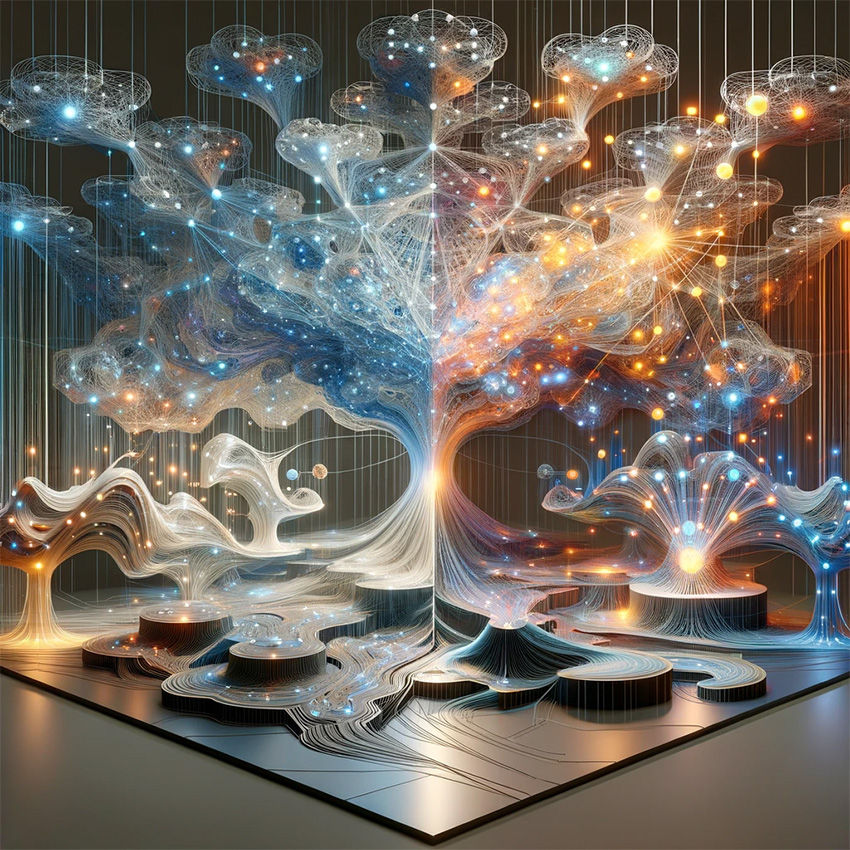 ChatGPT: The installation visually represents the complex, interconnected structure of neural networks. It features multiple layers and pathways, using light, projection, and interactive elements to simulate data flow and processing. The design creates a multi-sensory experience, inviting visitors to walk through and interact with the installation, deepening their understanding of neural networks in AI. Dynamic lighting and abstract forms convey the adaptability and learning capabilities of these networks, making the installation not only educational but also visually and experientially engaging.