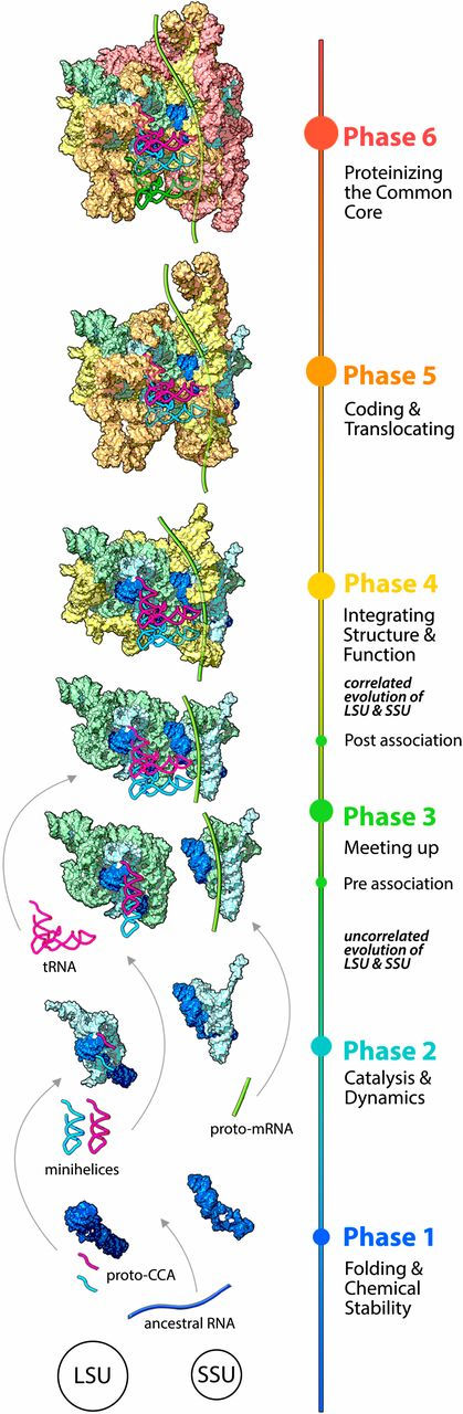 Figure 4: The first six phases of the accretion model of ribosomal evolution.