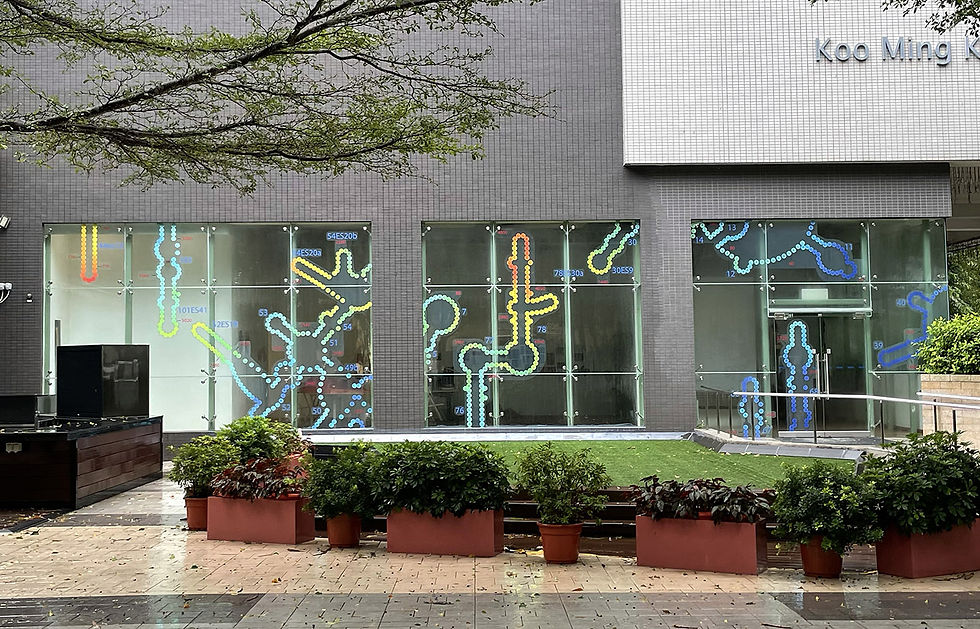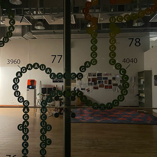 Once the interior installation was complete, sections of the ribosome diagram were enlarged and attached as semi-transparent, coloured vinyl to the gallery windows, creating a contrast in scale with the city plans and modeled landscape inside.